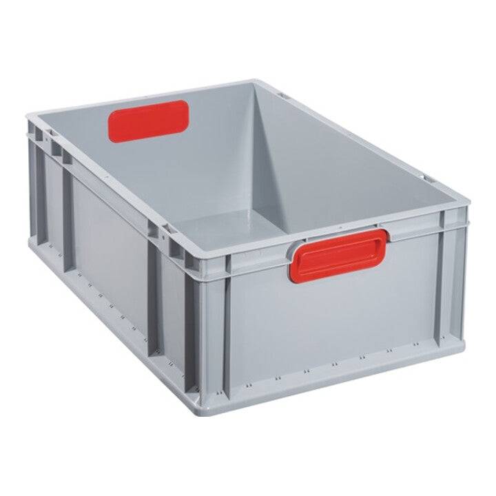 szary - stabilny wymiarowo polipropylen - ścianki wzmocnione żebrami - dostosowany do wymiarów palet Euro - samocentrujący, wszechstronny rant do układania w stos - optymalne czyszczenie dzięki gładkim ściankom wewnętrznym - odporny na większość kwasów i olejów - odporny na temperaturę od -10 °C do +60 °C - zamknięte ścianki - czerwony, zamknięty uchwyt