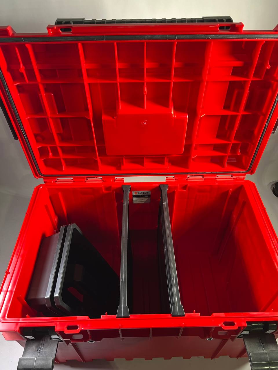 RED ULTRA HD to specjalna edycja produktów Qbrick System ONE wykonanych z ultra wytrzymałego tworzywa sztucznego, które charakteryzuje się wyjątkową odpornością na uszkodzenia mechaniczne. Przeprowadzone testy udarności potwierdzają jego wyjątkową trwałość, nawet w warunkach poniżej 0°C. QS ONE Cart RED Ultra HD to mobilna skrzynka narzędziowa o dużej pojemności wyposażona w duże koła osadzone na metalowej osi. Wyposażona jest w teleskopowy uchwyt wykonany z anodyzowanego aluminium. Skrzynka wyposażona jest w dwie półki i dwie przegrody dla lepszej organizacji wnętrza. Wersja 2.0 linii produktów ONE to nowa generacja skrzynek narzędziowych i organizerów o wzmocnionej konstrukcji. Dzięki dodatkowemu przystosowaniu obudów do wkładek gwintowanych M8, system można dostosować do potrzeb użytkownika. Niestandardowa wersja tego modelu skrzynki jest wyposażona w dziesięć gwintowanych wkładek M8, które umożliwiają dostosowanie przez użytkownika. Standardowa pokrywa (VARIO) w QS ONE Cart jest wyposażona w dodatkowe złącza, które umożliwiają podłączenie tej wersji pokrywy do modeli Toolbox z linii Qbrick System PRO (500, Toolcase, Toolbox, Organiser 100,200,300 i alternatywnie PRO 600). Jest to unikalna wersja skrzynki, dzięki której użytkownik może połączyć elementy z dwóch linii produktowych.