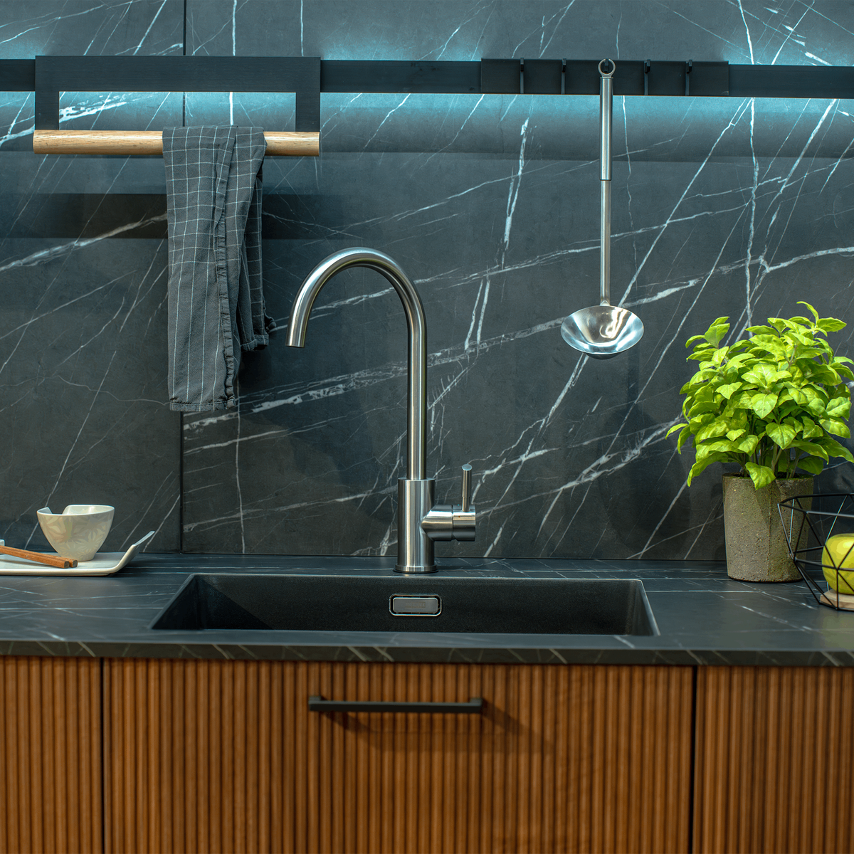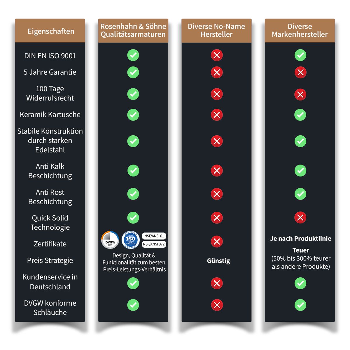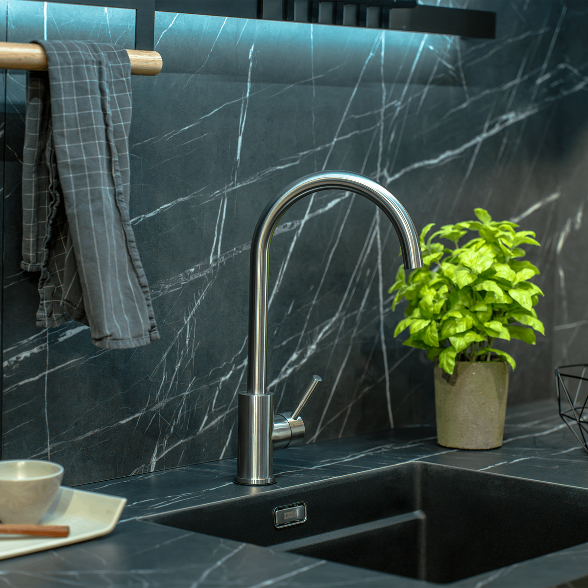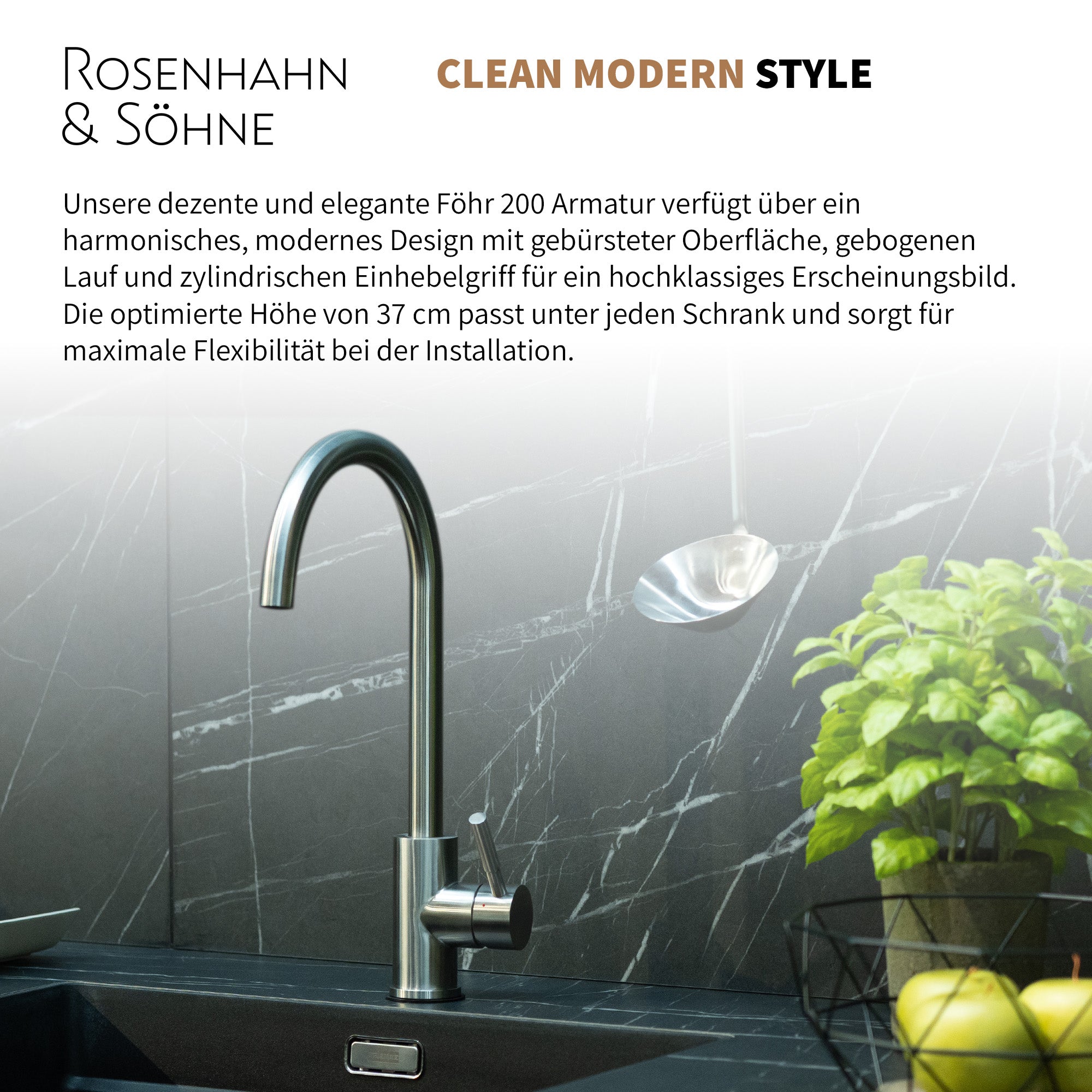 Bateria kuchenna Föhr 200 marki Rosenhahn & Söhne łączy w sobie trwałość i nowoczesne wzornictwo. Obrotowy zakres obrotu ułatwia dotarcie do dowolnego punktu wewnątrz i na zewnątrz zlewu. Może być również używana z dowolnej strony i można ją łatwo odchylić, aby uzyskać więcej miejsca! Elegancki design ze szczotkowanej stali i wysokiej jakości mosiężne wykończenie sprawiają, że nasza bateria zlewozmywakowa przyciąga wzrok. Stop chroni również przed osadzaniem się kamienia i rdzą. Szczegółowa i ilustrowana instrukcja obsługi pomoże w bezproblemowej instalacji baterii.