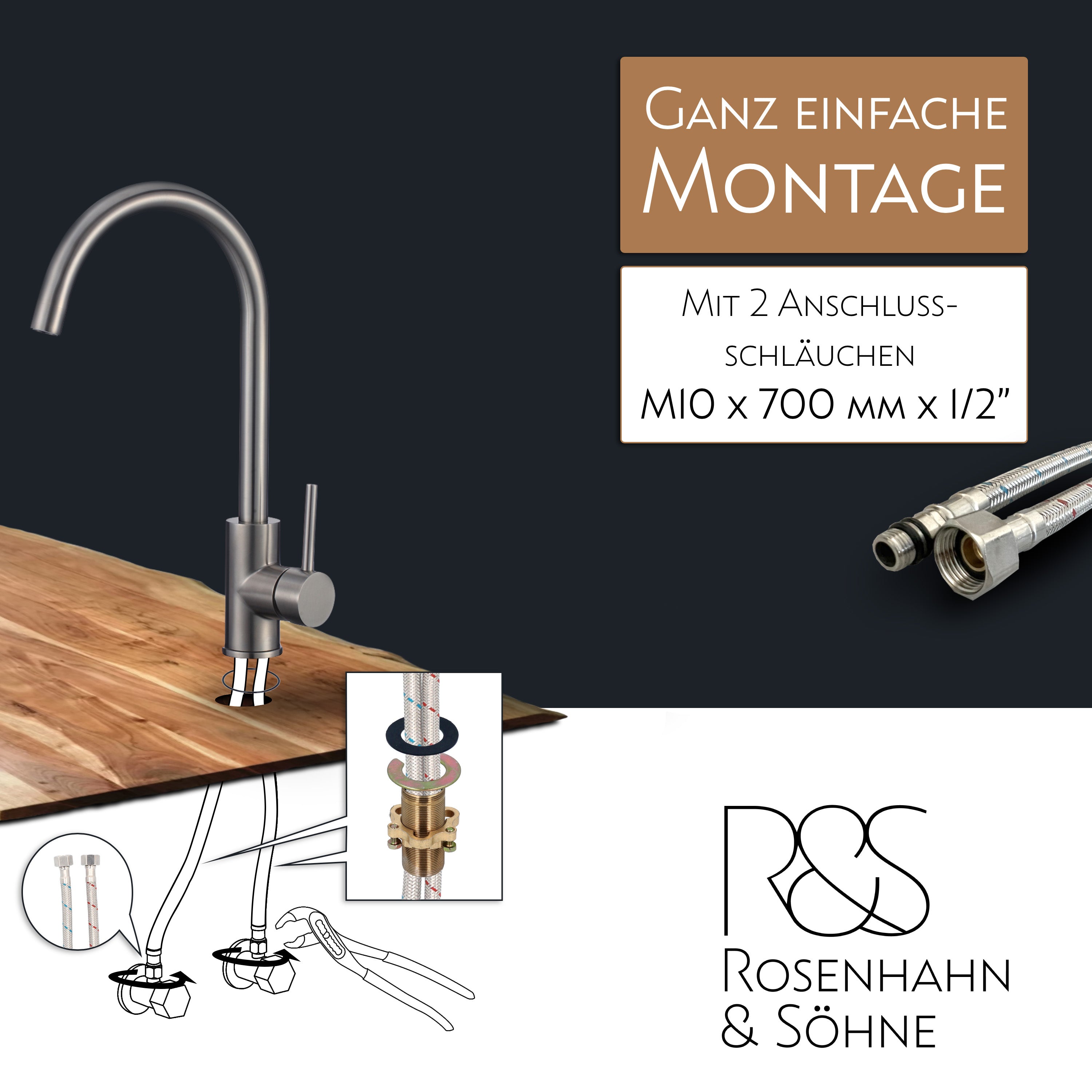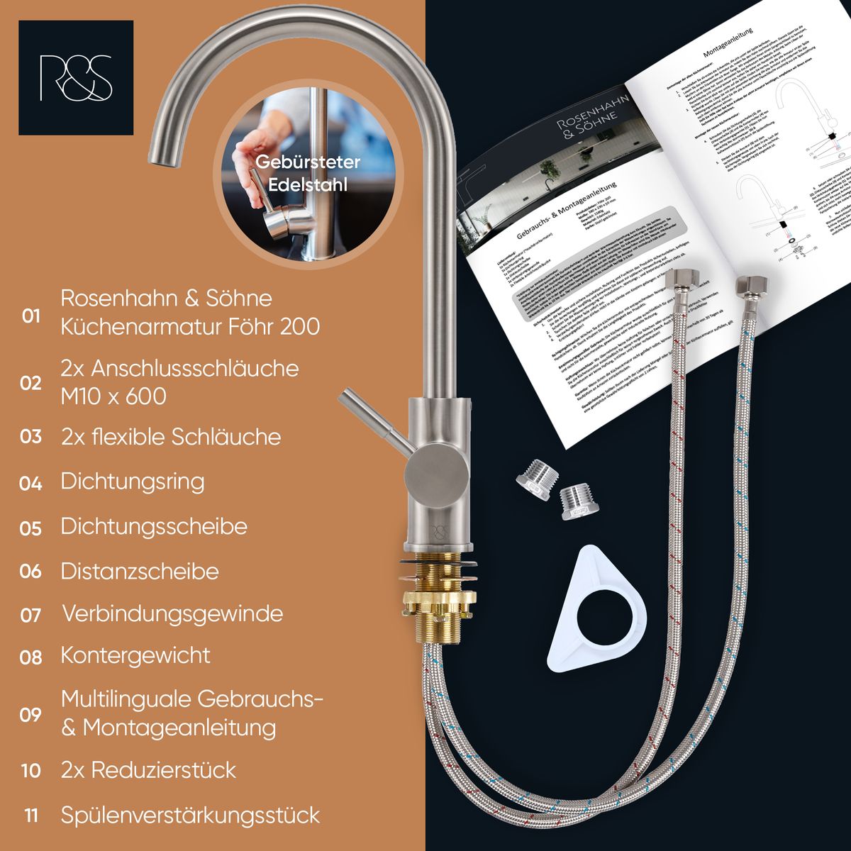 Rosenhahn & Söhne Föhr 200 bateria kuchenna obrotowa 360° - bateria kuchenna [stal nierdzewna szczotkowana] - 2-drożna regulowana bateria zlewozmywakowa + węże przyłączeniowe