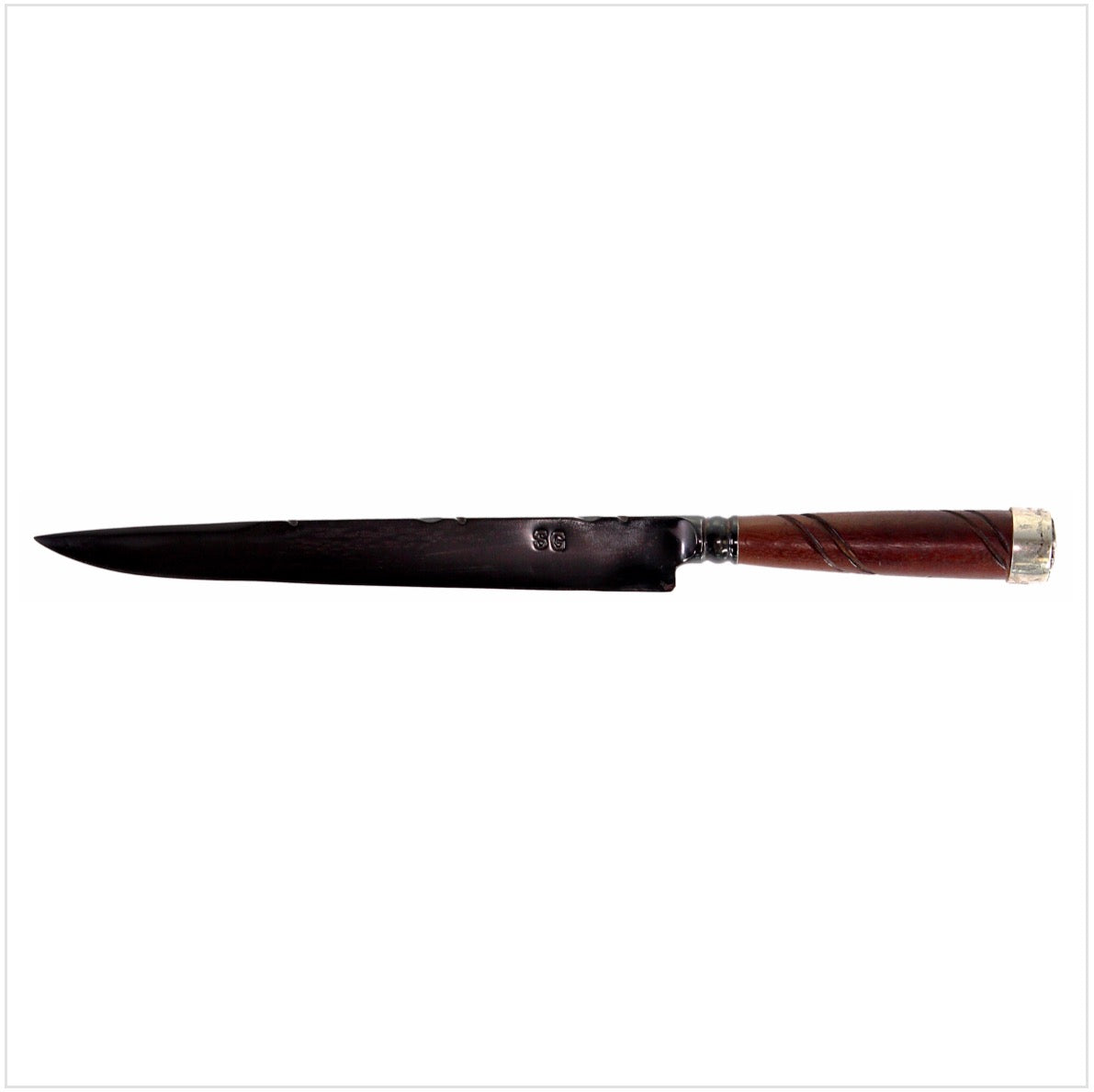 Wspaniały nóż kuchenny od wysokiej jakości producenta noży Serra Grande: Ten ręcznie wykonany "Faca Pra Lida Estreita Cabo Redondo Carbono", co tłumaczy się jako wąski nóż węglowy z okrągłą rękojeścią, zachwyca charakterystyczną czarną kolorystyką ostrza i zabawnymi rzeźbieniami rękojeści.Z tym nożem można z łatwością opanować nawet najtrudniejsze zadania, takie jak rzeźnictwo, rozbiór i oporządzanie zwierząt polnych. Długość ostrza wynosząca 25,4 centymetra i grubość ostrza wynosząca 3 milimetry sprawiają, że nóż jest idealnym rozwiązaniem do zadań kuchennych związanych z mięsem i warzywami. Aby spełnić najwyższe standardy, do produkcji używane są tylko najlepsze materiały: Ostrze wykonane jest z nierdzewnej stali sprężynowej węglowej (AISI 5160), która jest niezwykle wytrzymała, elastyczna i odporna na zmęczenie, podczas gdy elegancka rękojeść wykonana jest z drewna imbuia, znanego również jako drzewo pieprzowe lub orzech brazylijski. Ciemnobrązowe drewno o drobnoporowatej strukturze ma ciemne smugi i wygląda jak drewno orzecha włoskiego, chociaż nie jest to drzewo orzechowe. Jest twarde i trwałe, a staranne suszenie, wygładzanie i polerowanie zapewnia mu wspaniały chwyt.