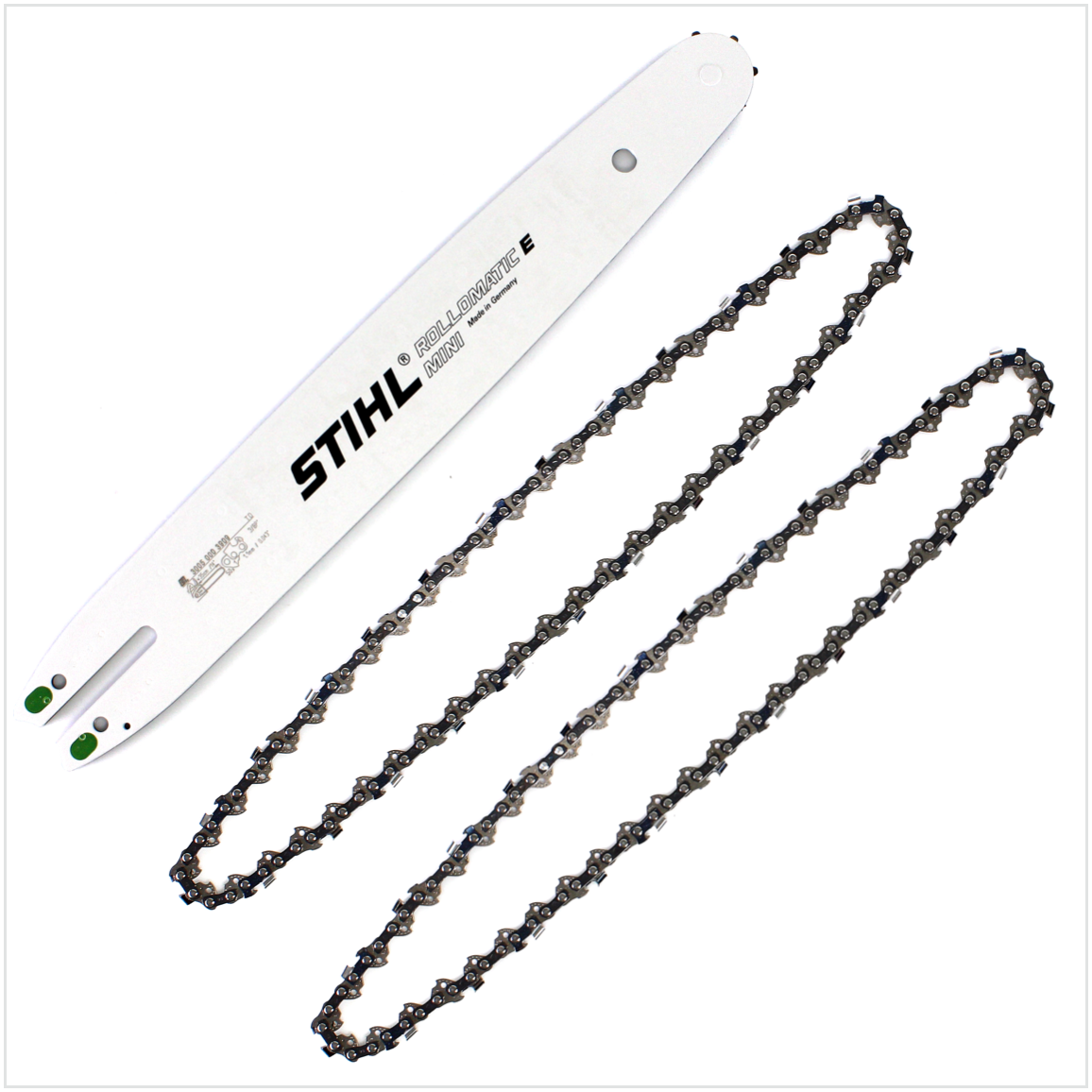 Carril guía STIHL Rollomatic E Mini 35cm 1,1mm 3/8" 7 dientes (3005 000 3909) + 2x Cadena de sierra STIHL Oilomatic Picco Micro Mini 3 (PMM3) semicincel 3/8"P 1,1mm 35 cm (3610 000 0050)