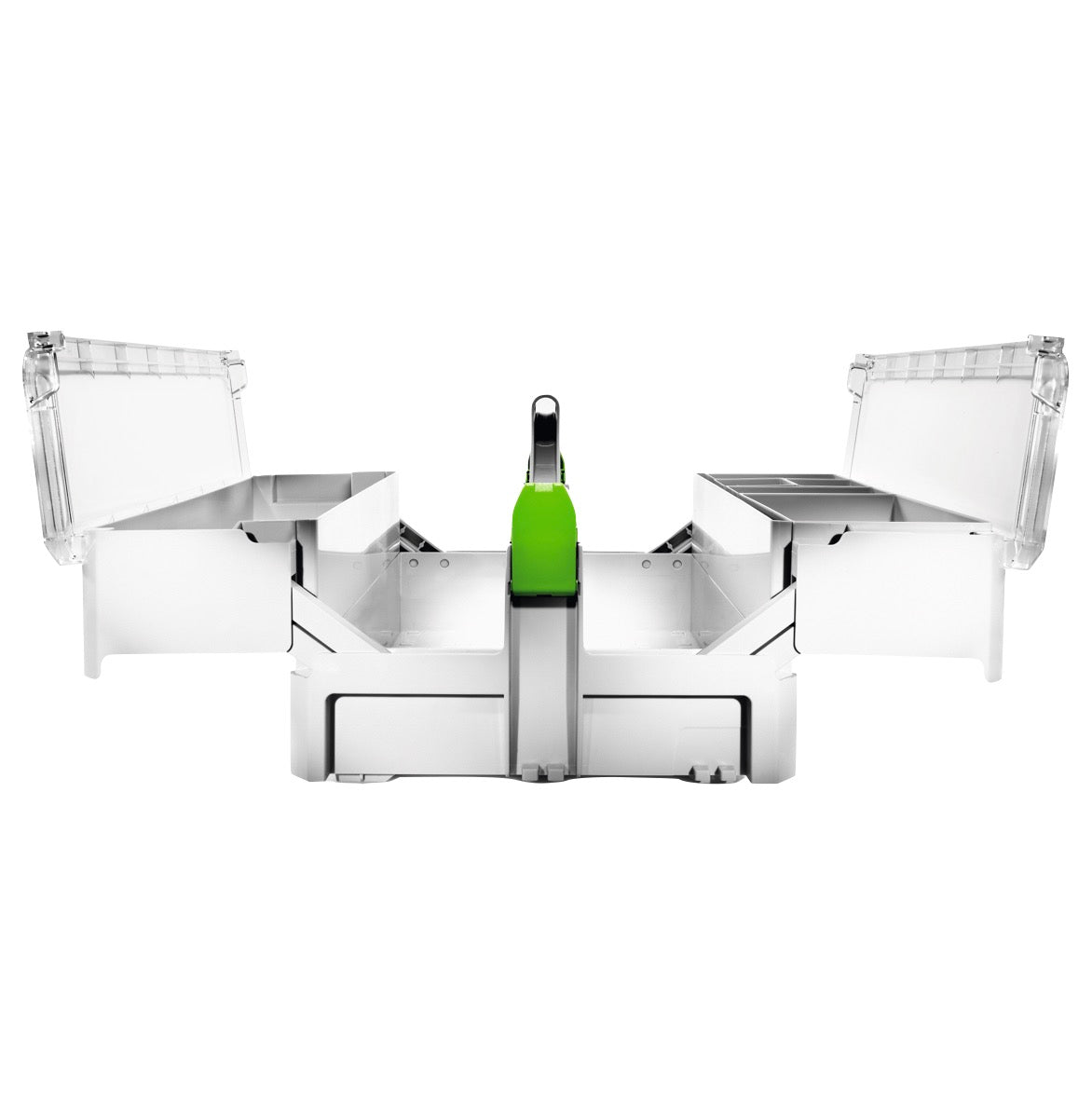 Walizka narzędziowa SYSTAINER SYS-StorageBox Festool jest szczególnie dobrze zorganizowana dzięki dwóm odchylanym górnym przegródkom. Drobne elementy, takie jak gwoździe, kołki, wkręty, bity, wiertła czy brzeszczoty do wyrzynarek, można posortować w pudełkach z wkładkami, które można dostosować do własnych potrzeb. Przezroczysta pokrywa pozwala od razu zobaczyć, które części gdzie się znajdują. Ten Systainer ma również indywidualnie wyjmowane pudełka na wkładki i można go łączyć z całym programem Systainerów Festool (z wyjątkiem SYS-MINI).
