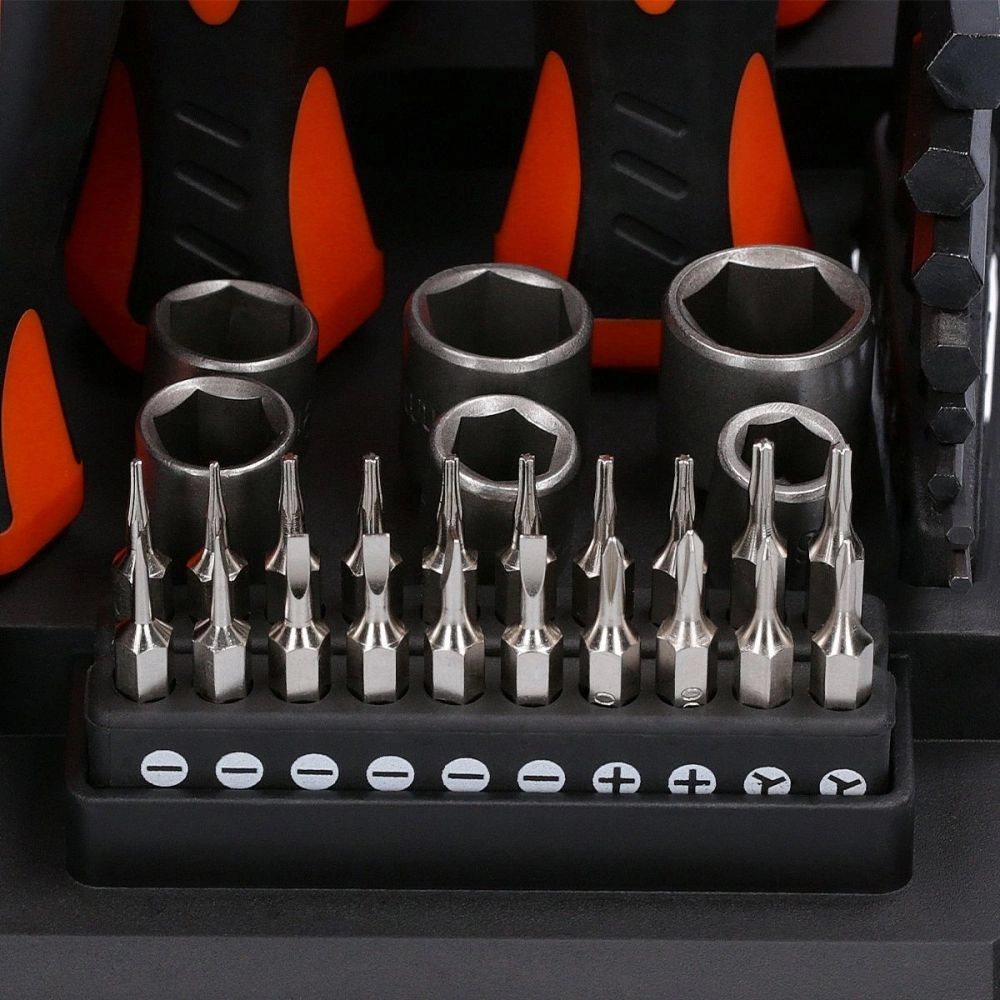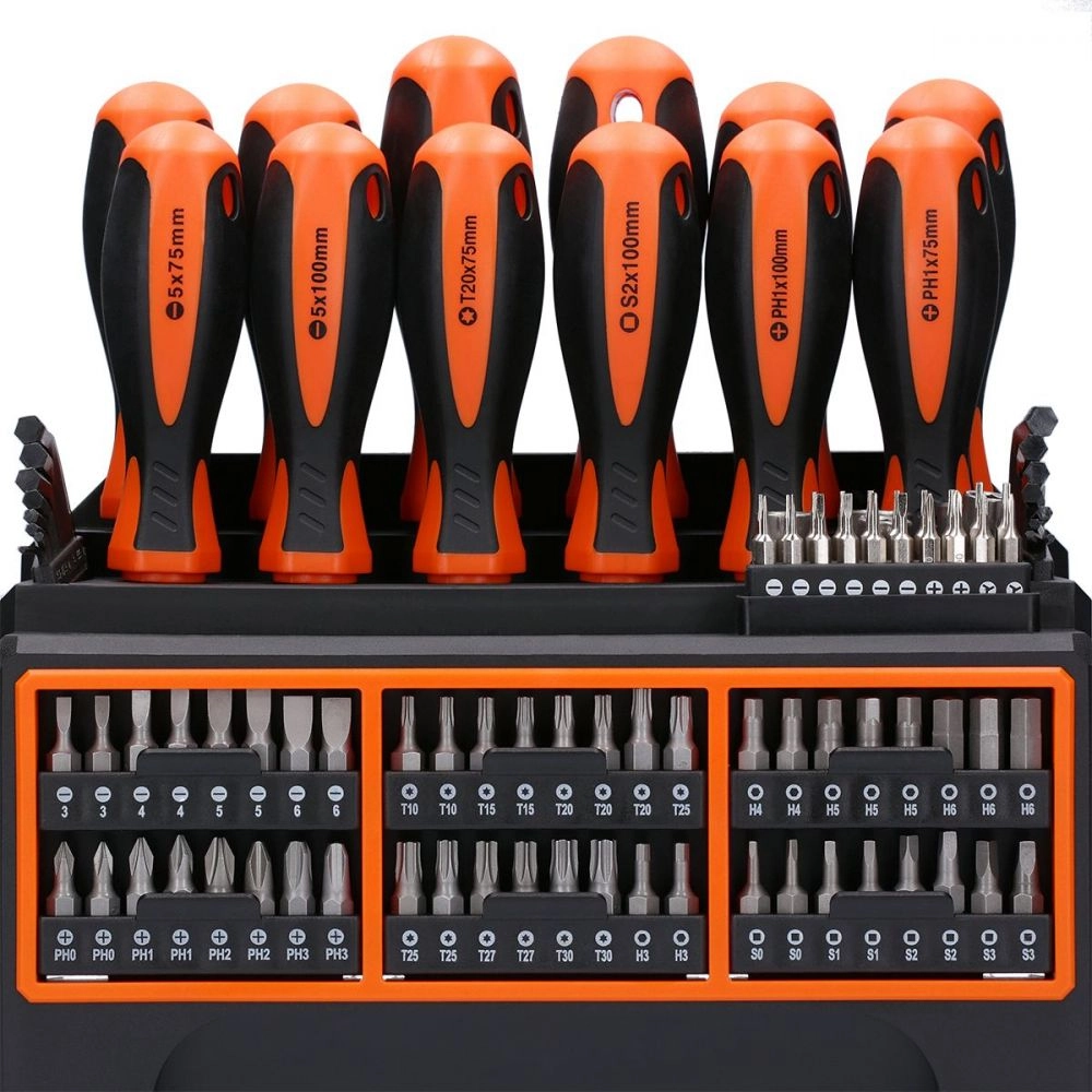 Este juego de destornilladores de 114 piezas, profesional pero asequible, le ayudará a completar casi cualquier trabajo de bricolaje. El volumen de suministro de este juego incluye 1 destornillador de punta, 1 destornillador de punta de precisión, 16 destornilladores, 48 puntas S2 de 1", 16 llaves Allen, 20 puntas de precisión, 6 llaves de vaso, 6 destornilladores de precisión, así como un estante para herramientas que contiene Las herramientas mencionadas están organizadas. Además, el estante para herramientas se puede instalar en la pared o en el armario de almacenamiento de su taller y garaje. en las herramientas aseguran que los tornillos permanezcan donde deben. Además, las puntas magnéticas tienen la ventaja de que si un tornillo o una pequeña pieza de trabajo magnética cae en una grieta, se puede quitar con el destornillador. Además, cada herramienta de este juego tiene. ha sido endurecido y revenido y está fabricado en acero Cr-6150 S2, lo que confiere a las herramientas la capacidad de soportar las fuerzas ejercidas durante el trabajo, para que pueda trabajar con menor fatiga. Los mangos de las herramientas han sido diseñados para ser especialmente ergonómicos. WellCut® ofrece una innovadora y completa gama de productos de accesorios para herramientas eléctricas, herramientas manuales y muchas otras herramientas profesionales que ofrecen una solución excepcional tanto para profesionales como para entusiastas del bricolaje.