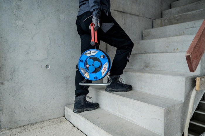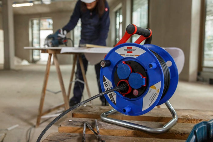Bęben kablowy Garant IP44 do zastosowań komercyjnych/budowlanych z kablem o długości 25 m w kolorze niebieskim firmy Brennenstuhl imponuje jakością i bezpieczeństwem we wszystkich obszarach. Bęben kablowy jest idealny do użytku na placach budowy i na zewnątrz. Zachwyca również następującymi cechami Innowacyjny uchwyt do przenoszenia "cablepilot" dla idealnego prowadzenia kabli. Odchylany z obu stron umożliwia wygodne przenoszenie i zawieszanie Kabel RN jest dopuszczony do trudnych warunków budowlanych zgodnie z VDE 0100 część 704 Z obrotowym uchwytem do wygodnego zwijania Stopień ochrony IP44 Długość kabla 25 m Oznaczenie kabla H07RN-F 3G1.5 Jakość kabla Guma neoprenowa Kolor kabla Czarny Średnica szpuli 240 mm
