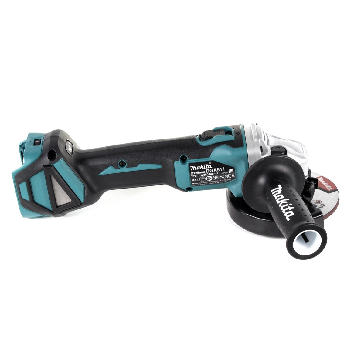 La nueva amoladora angular a batería de Makita está a la última en todos los aspectos: el motor eléctrico sin escobillas aprovecha la carga de la batería de forma aún más eficiente y trabaja con un desgaste absolutamente mínimo. La velocidad y el par se adaptan automáticamente a la situación. La velocidad también se puede ajustar manualmente de 3000 a 8500 rpm. Un limitador electrónico de corriente protege el motor contra sobrecargas, se enciende una luz de advertencia y se reduce el flujo de corriente al motor. La amoladora angular está protegida contra el polvo y las salpicaduras de agua y dispone de almohadillas de goma antideslizantes en la carcasa. La tecnología de detección de retroalimentación activa (AFT) desconecta la DGA 511 si el disco se detiene repentinamente para proteger al usuario de una oscilación brusca del aparato. Un indicador LED en la amoladora angular muestra en todo momento el nivel de carga actual de la batería.