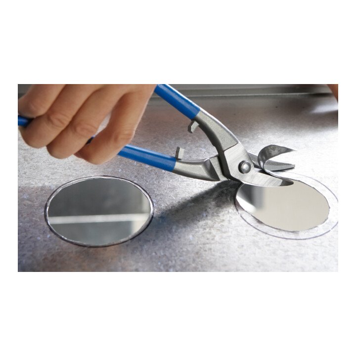 Cantos de corte de acero de calidad 59 HRC templado por inducción - para cortes cortos rectos y curvos (radios pequeños) - cabeza de tijera especialmente delgada - con patas abiertas y dobladas - mangos bañados en PVC