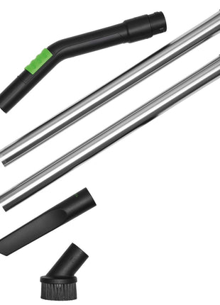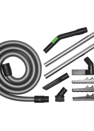 Este set de limpieza es adecuado para todos los sistemas de aspiración móviles CT y VCP de Festool (excepto VCP 30 E). Contiene una manguera de aspiración de D36 mm, un tubo manual curvo con regulación de la potencia de aspiración, dos tubos de extensión de acero inoxidable, cuatro boquillas para suelos, una boquilla para rincones y un cepillo de aspiración.