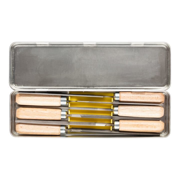 con mango de madera - ideal para trabajos de limado ligeros y de filigrana - en caja metálica - contenido: plano romo, plano puntiagudo, redondo, cuadrado, triangular, semirredondo