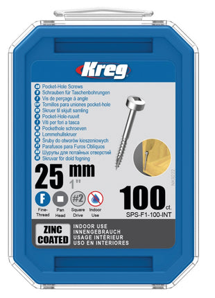 Tornillo de cabeza cilíndrica KREG Pocket-Hole 25 mm 500 uds. (SPS-F1-500) cuadradillo, rosca parcial, rosca fina, autorroscante, galvanizado