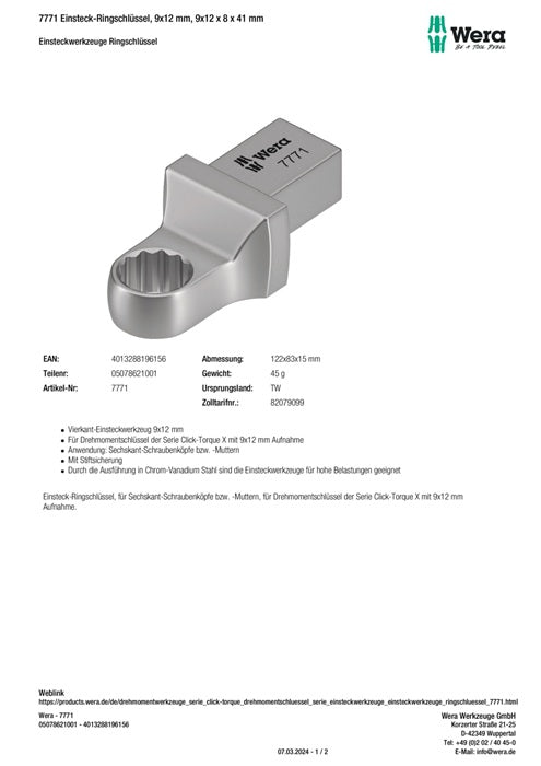 Llave de caja Wera 7771 ( 8000377411 ) Ancho de llave 8 mm 9 x 12 mm