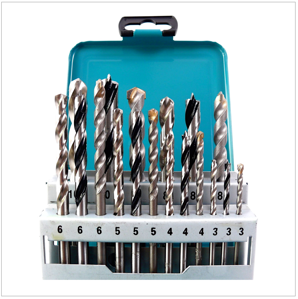El juego de brocas Makita incluye 18 cabezales diferentes, cada uno en 6 tamaños diferentes, adecuados para taladrar madera, metal y piedra. El juego de brocas se entrega en una pequeña caja metálica de Makita, con un dispositivo de montaje para cada cabezal de perforación.