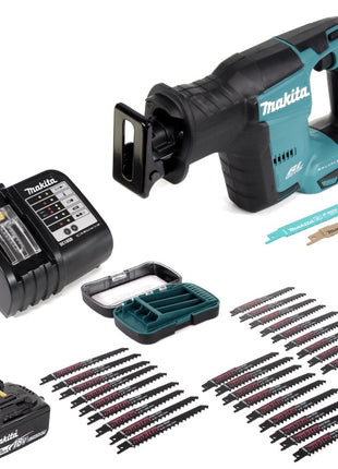 Sierra de sable inalámbrica Makita DJR 188 Sierra de sable sin escobillas de 18 V + 1 batería de 4,0 Ah + cargador + juego de hojas de sierra de 27 piezas