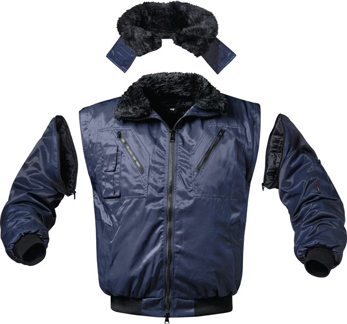 Material exterior: 60% algodón / 40% poliéster, aprox. 250 g/m² - forro: 100% poliéster - fibra de piel: 100% poliéster - función 4 en 1 - cuello y mangas desmontables - forro de piel sintética desmontable - cómodo forro de poliéster en el interior - tejido de mezcla de algodón y poliéster resistente a la abrasión en el exterior - repelente al agua gracias a su revestimiento de alta calidad - el revestimiento permite la limpieza y el lavado a máquina a 40 °C - robusta cremallera frontal de 2 vías - puños y dobladillo de punto - tapeta de botonescremallera frontal - puños y dobladillo de punto - tapeta de botones en el cuello para capucha - 2 bolsillos en el pecho y 1 bolsillo para móvil - 2 bolsillos en la cadera - 1 bolsillo en la manga - 1 bolsillo interior disponible bajo pedido tallas: XS-5XL