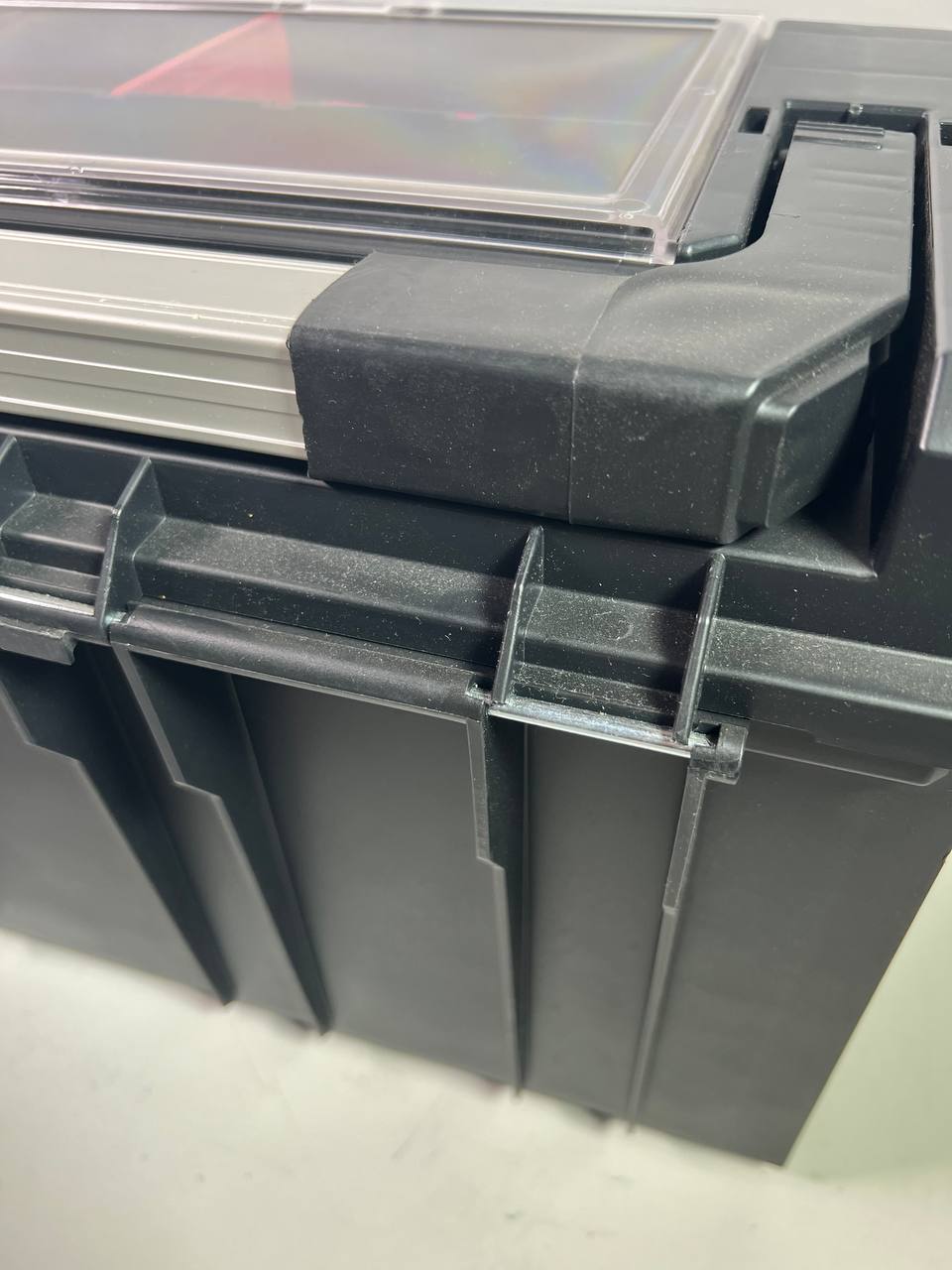 La PRO 700 es el modelo más grande que le permite transportar y almacenar herramientas de gran tamaño de forma segura. Conectando dos cajas entre sí, puede transportar una gran variedad de herramientas con una sola mano. El gran organizador Expert de la tapa de la caja tiene 11 compartimentos con separadores ajustables y ofrece espacio para un nivel de burbuja, brocas largas y accesorios más pequeños.