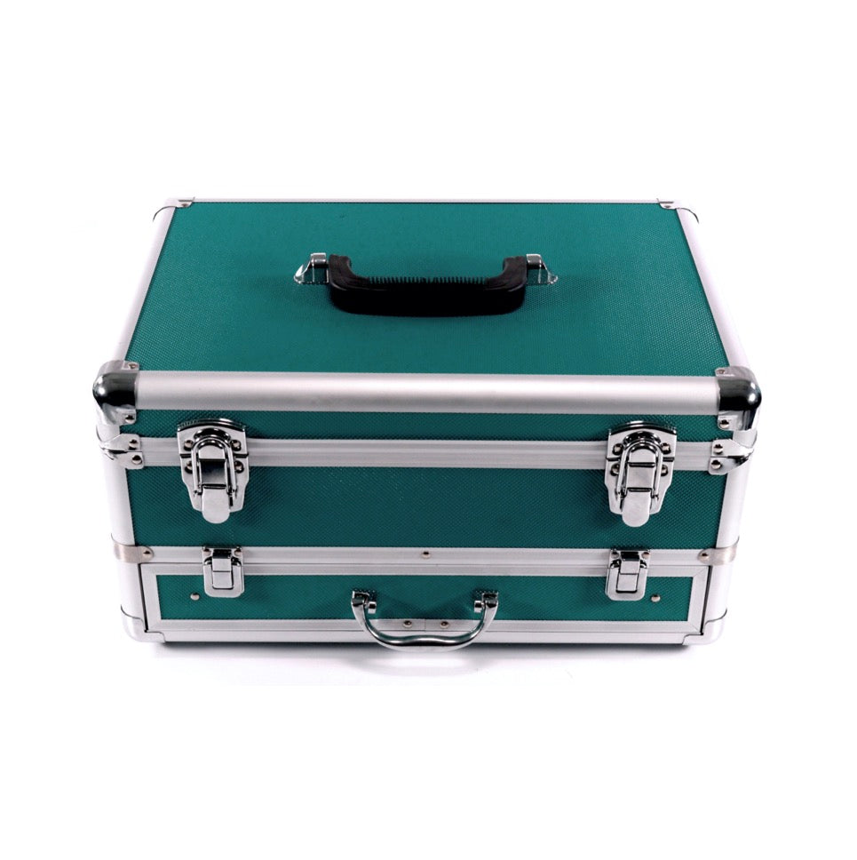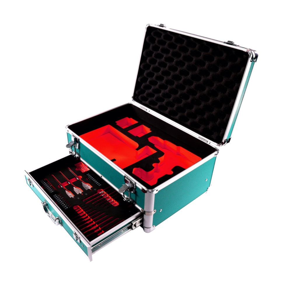 La maleta de herramientas de aluminio Toolbrothers TX ofrece suficiente espacio para una máquina (por ejemplo, un taladro percutor o una llave de impacto), un cargador y hasta dos baterías. El juego de brocas y brocas de 70 piezas en el cajón cubre todas las aplicaciones. Hay muchas variedades de brocas, cortadores, llaves de tubo y taladros disponibles. Ya sea madera, metal o piedra, el maletín contiene una gran variedad de brocas de los tamaños más habituales. El buen acabado de la carcasa promete una larga vida útil y además es muy agradable a la vista. El asa de transporte de goma es suave para las palmas de las manos y también se puede utilizar fácilmente con guantes. Los cierres metálicos de la caja son robustos y duraderos. Los insertos en la base y en la tapa garantizan un transporte seguro de las máquinas en el maletín. Con el maletín de aluminio TX se pueden guardar de forma segura en un solo maletín las herramientas de trabajo y los accesorios correspondientes.
